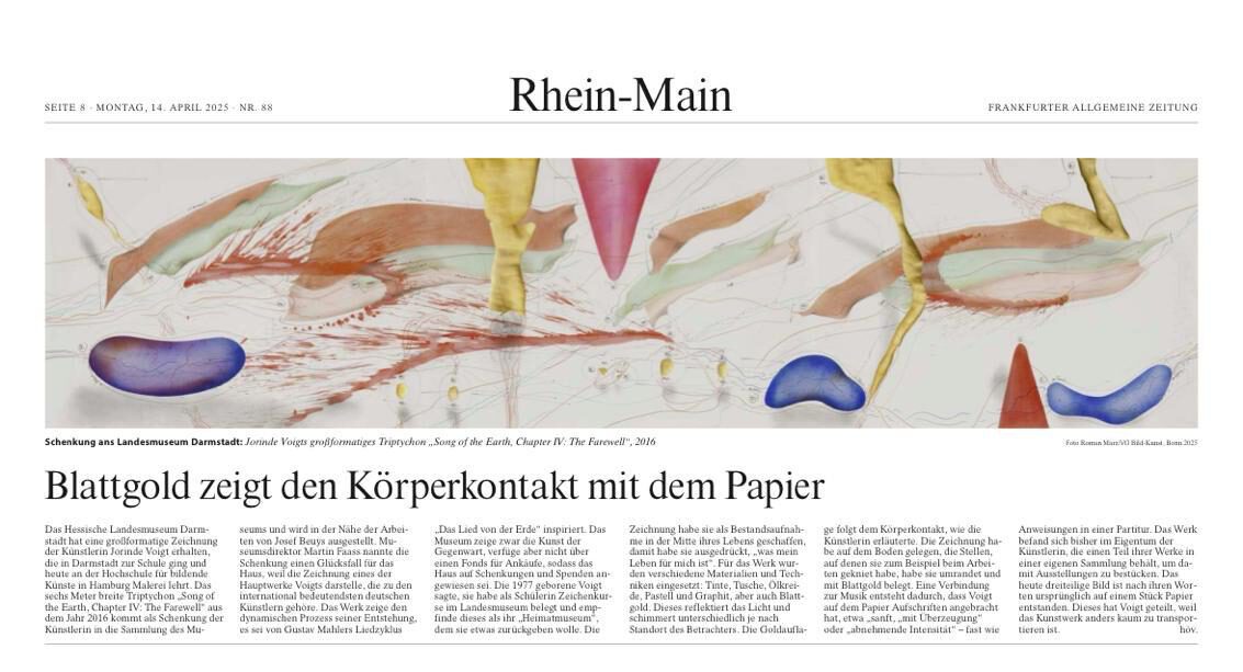 Schenkung ans Landesmuseum Darmstadt: Jorinde Voigts großformatiges Triptychon “Song of the Earth, Chapter IV: The Farewell”, 2016